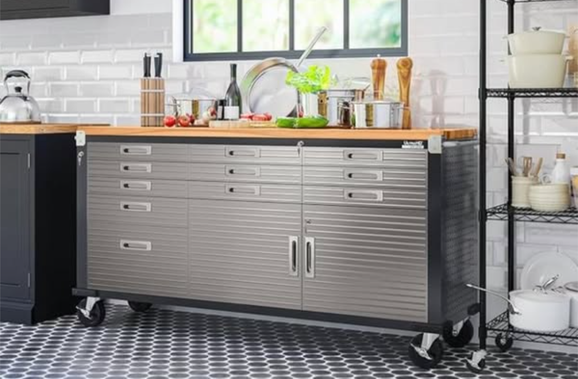 以 HS20262 工具櫃 為例,銀色櫃身穩重耐看,10個小抽屜、1個中抽屜、加上一個對開櫃位,內建模組化隔板,能依照物品大小自由分隔。原本是為螺絲、扳手分類設計,放在廚房則能輕鬆整理餐具、刀具、量杯到香料罐,井然有序不再找不到東西。媽媽再也不用為了找一個小零件或量匙,把整個櫃子翻得亂七八糟。櫸木實木桌板,不只堅固,還能直接當料理檯面使用;萬向輪設計,讓它能靈活移到餐桌旁、陽台或儲藏室,而且承重100kg以上,滿滿的鍋具也不怕壓壞。